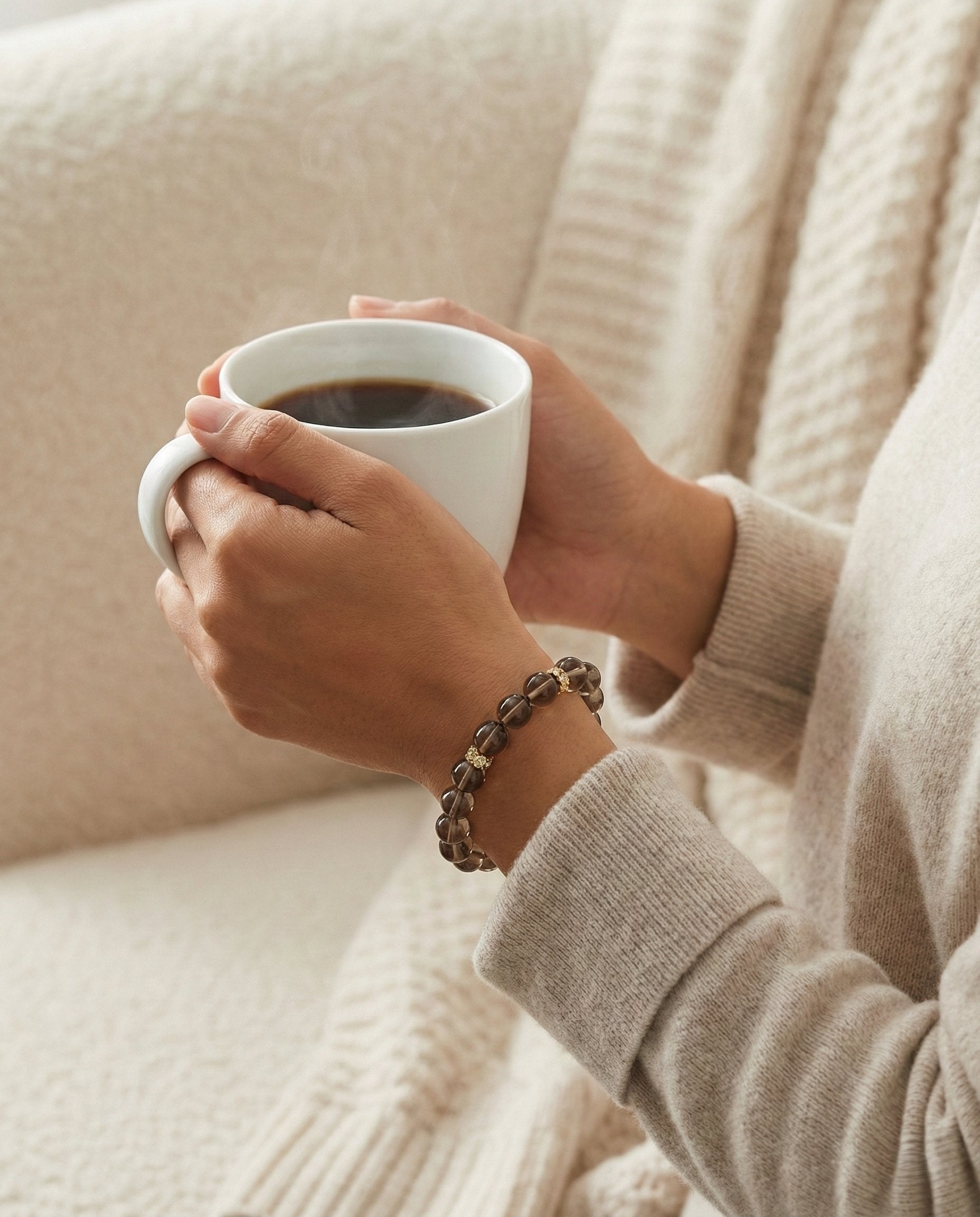 True stability is not about controlling the storm, but about remaining unmoved within it. The Citadel is a study in structural elegance, featuring the deep, translucent earth tones of natural Smoky Quartz. The bracelet orbits around a striking noir-enamel charm, detailed with architectural gold-tone lines that suggest a secure, fortified gate.