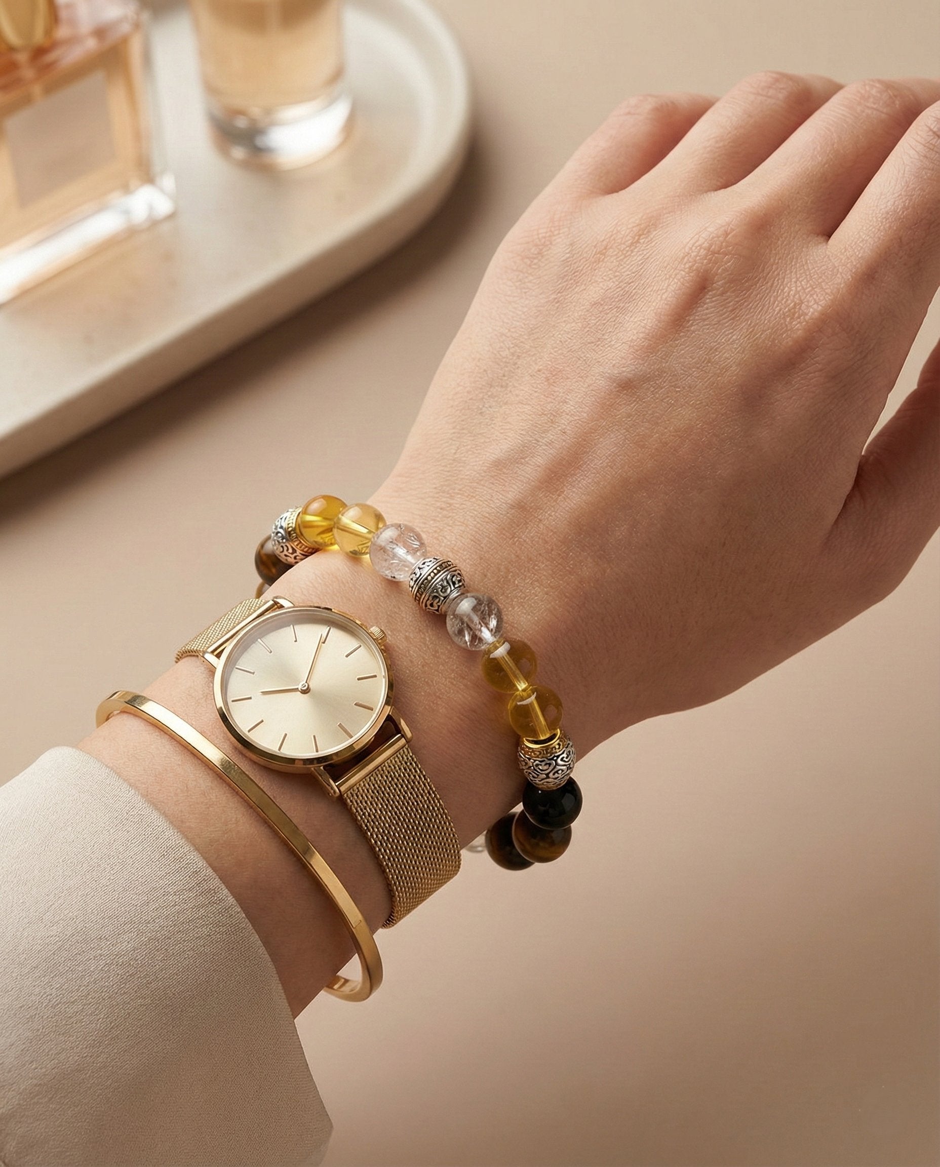 We observed that as ambitious individuals rise, they become magnets for both opportunity and envy. This bracelet is structured to manage that flow. The upper "Light" section (Citrine & Rutilated Quartz) acts as an antenna for prosperity, while the lower "Shadow" section (Obsidian, Smoky Quartz & Tiger Eye) forms the foundation walls. It is designed to be a closed loop of power: inviting the good in, and keeping the bad out.